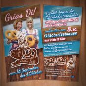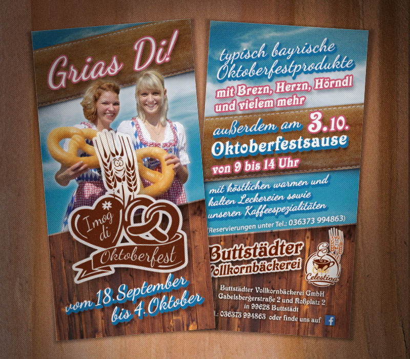 Das Café Celestina und die Buttstädter Vollkornbäckerei präsentieren mit diesen von Penzil gestalteten Flyer ihr Oktoberfest. Schön bayrisch lädt dieser zu speziellen Oktoberfestprodukten ein.