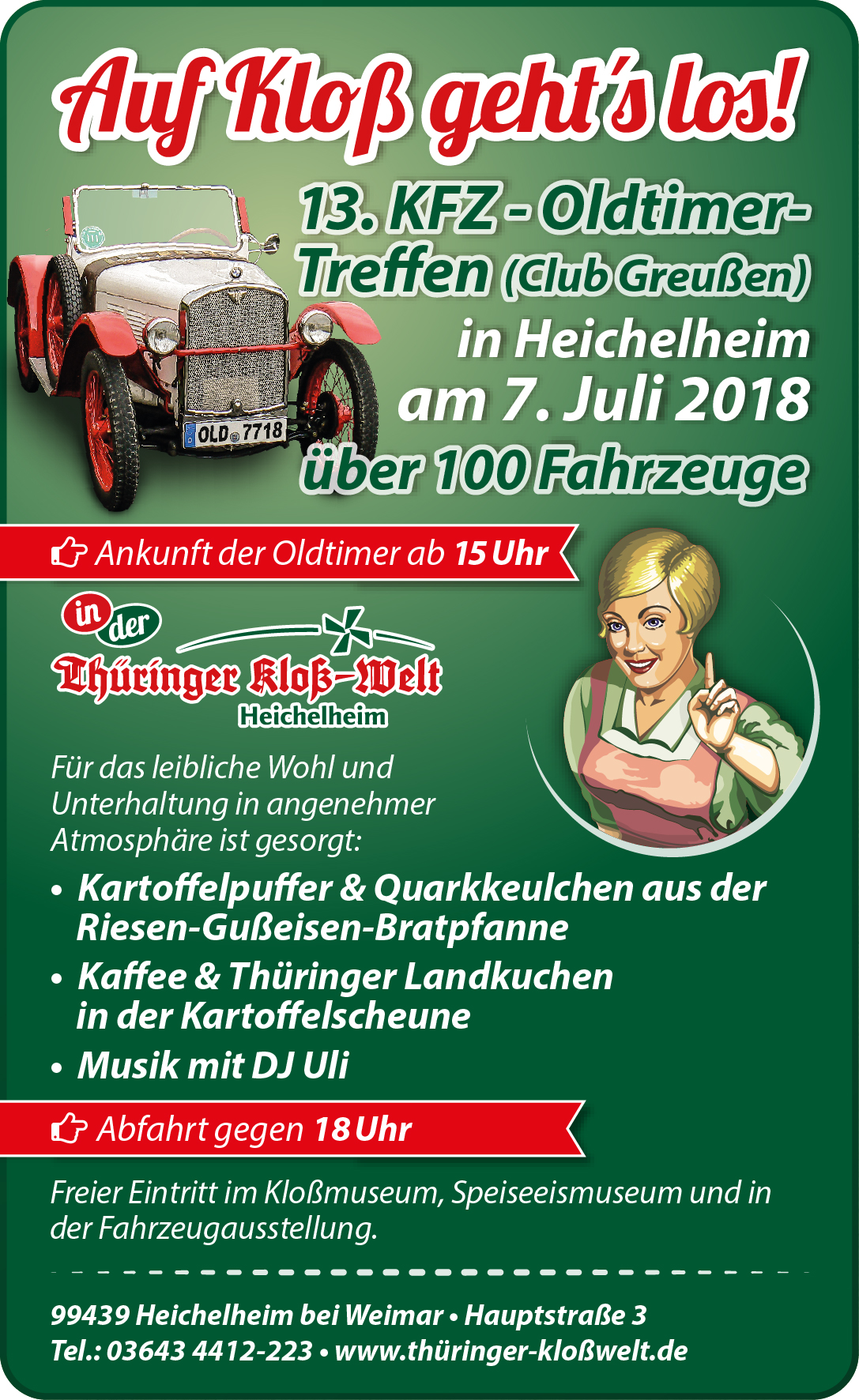 Für die optimale Bewerbung des 13. KFZ - Oldtimer-Treffen (Club Greußen) in der Thüringer-Kloß-Welt in Heichelheim erstellte Penzil eine Zeitungsanzeige.