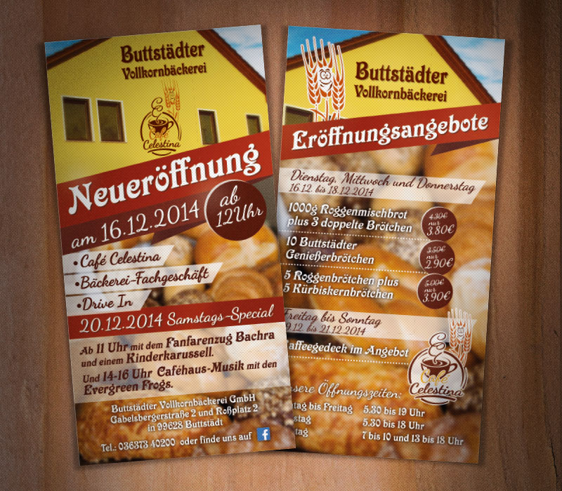 Es ist soweit, das neue Café Celestina der Buttstädter Vollkornbäckerei GmbH feiert Eröffnung. Penzil erstellte dazu die passenden Flyer und Plakate.