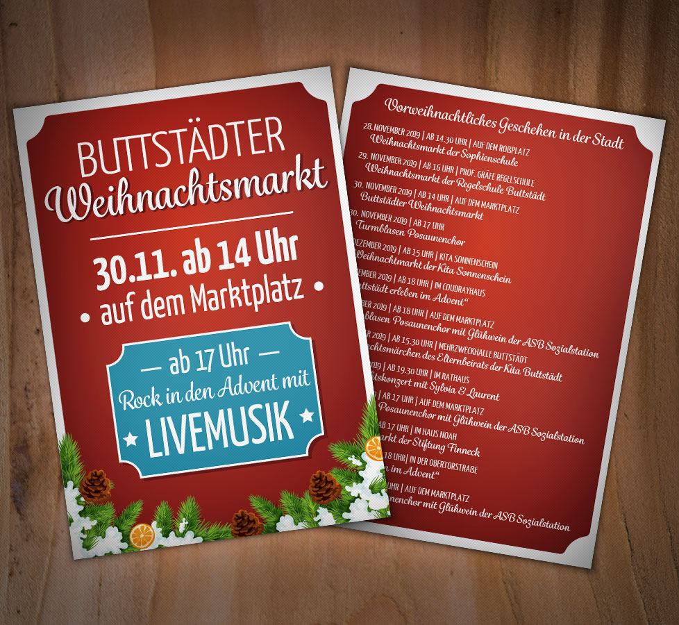 Penzil kreierte den doppelseitigen Flyer für den Buttstädter Weihnachtsmarkt. Mit diesem Flyer und weiteren Werbeträgern wie Plakate, Banner und Zeitungsanzeige ist für die Bekanntmachung des Marktes gut gesorgt.