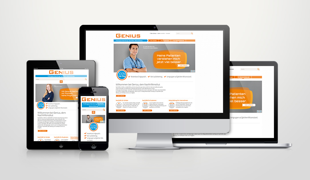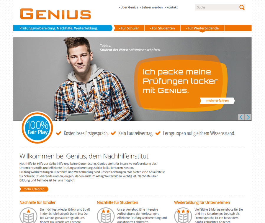 In Kooperation mit kaschwamm.de wurde das Redesign der Internetseite von GENIUS das Nachhilfeinstitut umgesetzt. Das Design punktet mit klaren Strukturen und aktuellen Techniken des Internets.