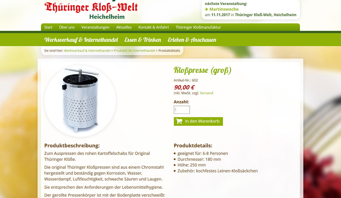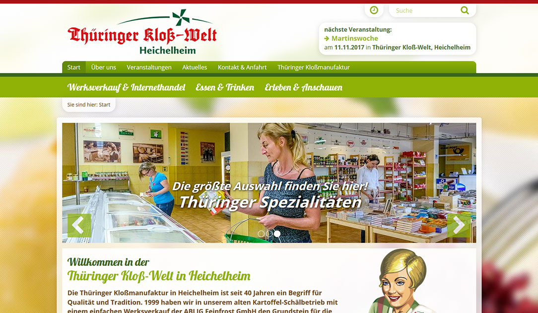 Die Internetseite der Thüringer Kloß-Welt hat ein neues Gesicht erhalten. Auf dieser erfährt man, was es dort zu entdecken gibt und welche kloßartigen Veranstaltungen an stehen. Zu dem bietet der integrierte Internethandel kloßartige Produkte zum shoppen an.